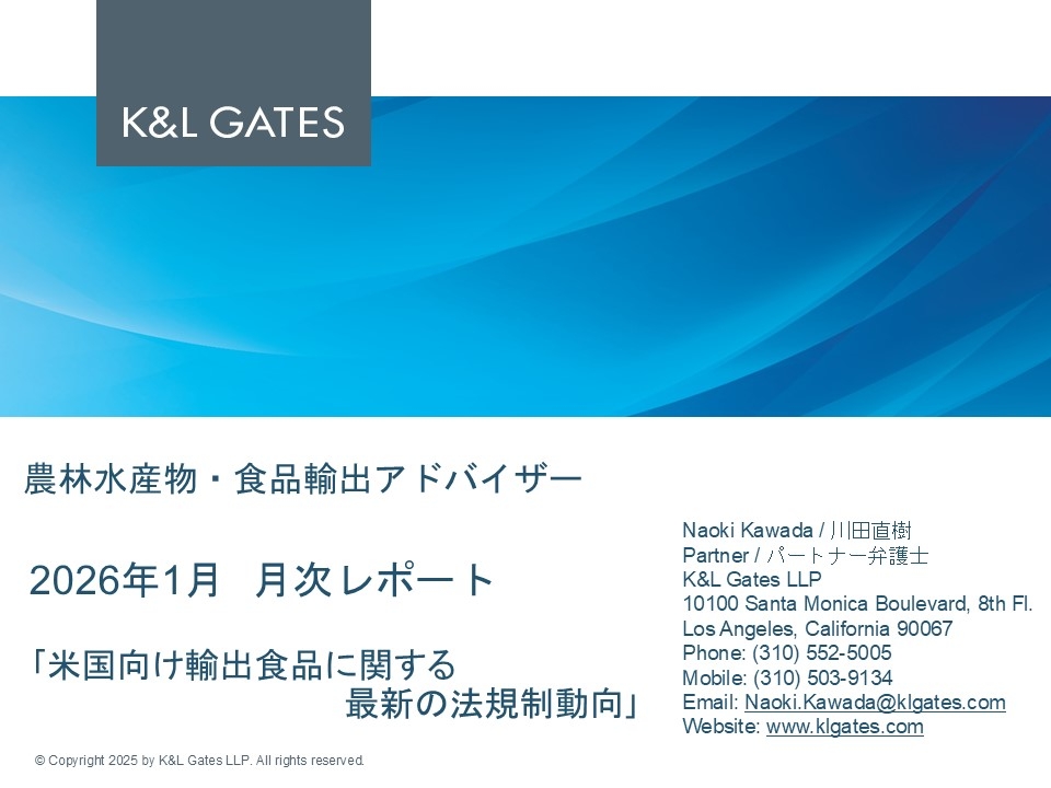 外務省では、日本産農林水産物・食品の更なる輸出促進に向け、在外公館が行う情報収集や対外的な働きかけに関する機能強化を目的として、令和4年度より「農林水産物・食品輸出促進アドバイザー」事業を実施しております。在ロサンゼルス日本国総領事館は令和7年度、当地法律事務所であるK&L Gates LLP.を「農林水産物・食品輸出促進アドバイザー」として業務委託し、
