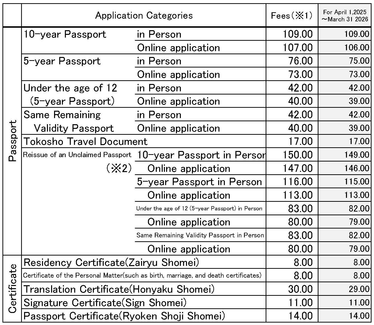 Japanese Passport & Certificate Fees
