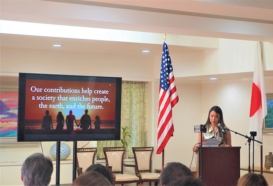 その後、次世代リーダーを代表し、サンディエゴ横浜姉妹都市ソサエティで活躍するオーウェン・ミラー氏(カリフォルニア州立大学サンディエゴ校在籍)より、VR(バーチャル・リアリティ)など先端テクノロジーを活用した姉妹都市交流の可能性が述べられました。続いて行われた企業プレゼンテーションでは、海藻を使用したフードテック事業で急成長を続けるCashi Cake inc.(本社ロサンゼルス)のCEO・三木アリッサ氏が、自社の高級和菓子ブランド誕生背景には、技術の高い日本企業とアメリカ市場を結びけた成功例が存在していることなどを説明しました。