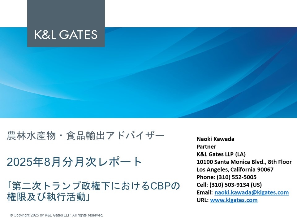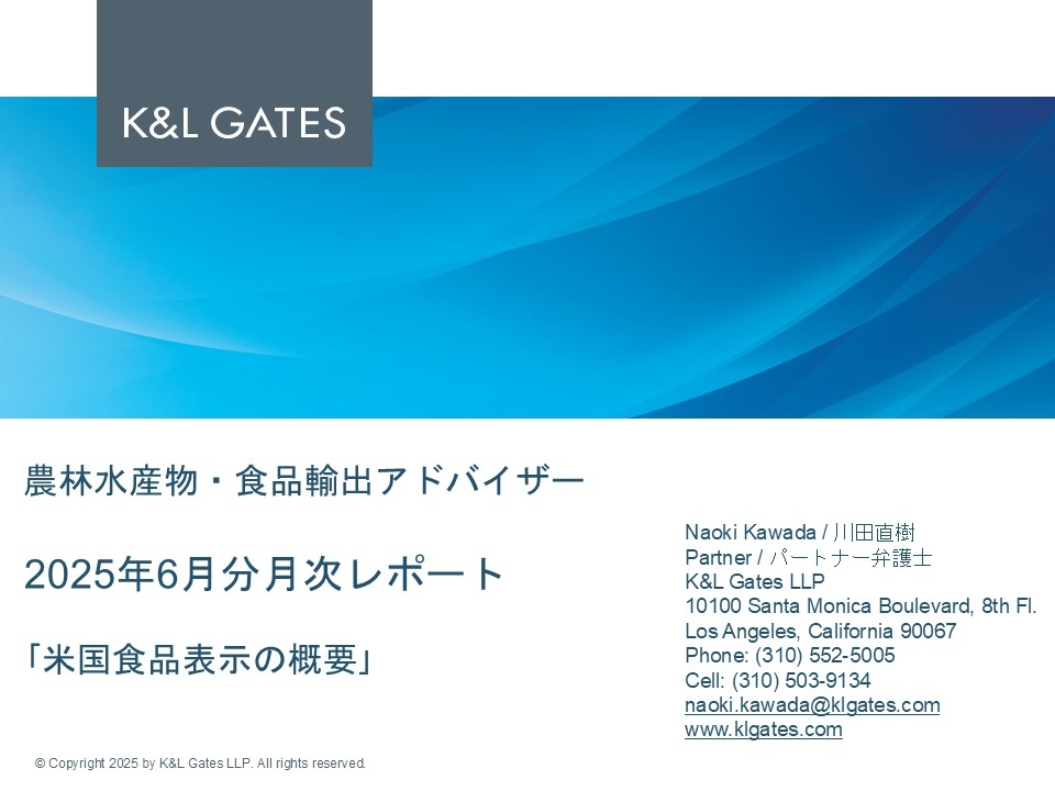 外務省では、日本産農林水産物・食品の更なる輸出促進に向け、在外公館が行う情報収集や対外的な働きかけに関する機能強化を目的として、令和4年度より「農林水産物・食品輸出促進アドバイザー」事業を実施しております。在ロサンゼルス日本国総領事館は令和7年度、当地法律事務所であるK&L Gates LLP.を「農林水産物・食品輸出促進アドバイザー」として業務委託し、
