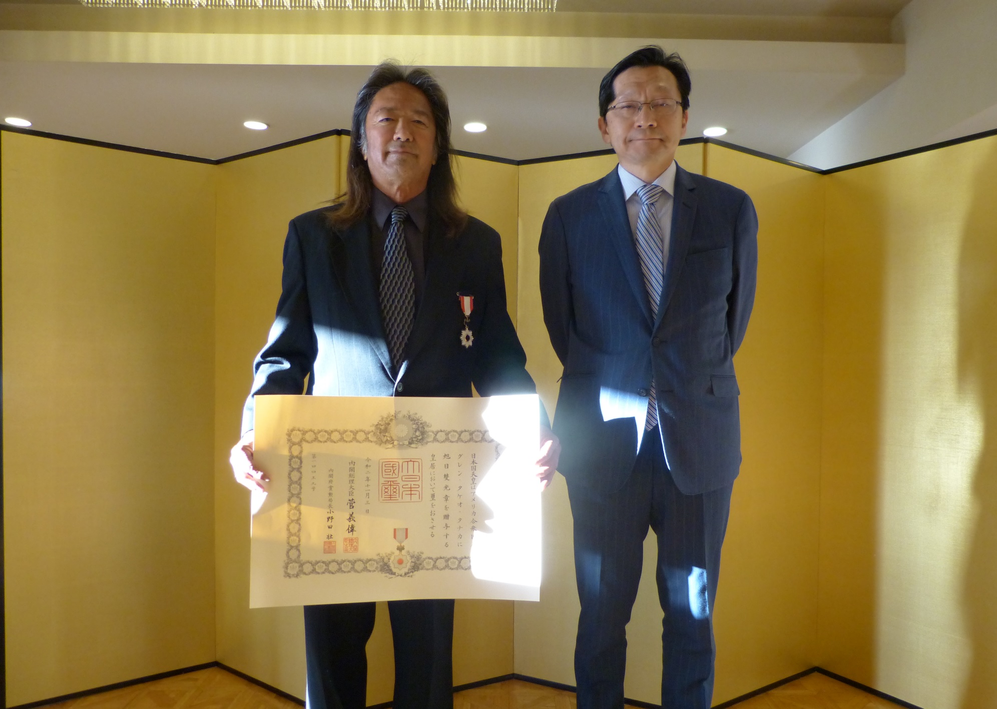 令和2年11月3日に令和2年秋の叙勲受章者が発表され,当館管轄地域からはグレン・タケオ・タナカ氏が旭日双光章を受章されました。